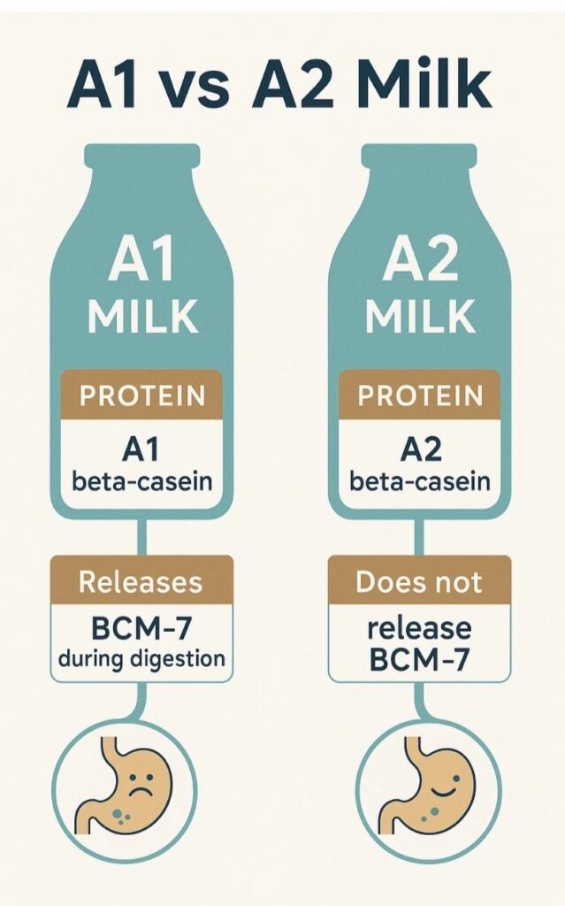 A1 and A2 milk differ by one amino acid. That difference causes A1 milk to release BCM-7 during digestion, which can slow the gut, increase inflammation and cause discomfort in sensitive individuals.